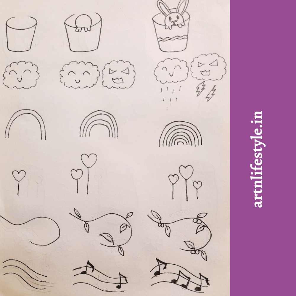 These random doodles include simple drawings like clouds, butterflies, ribbon and food starting from basic shapes and adding small details in each step.