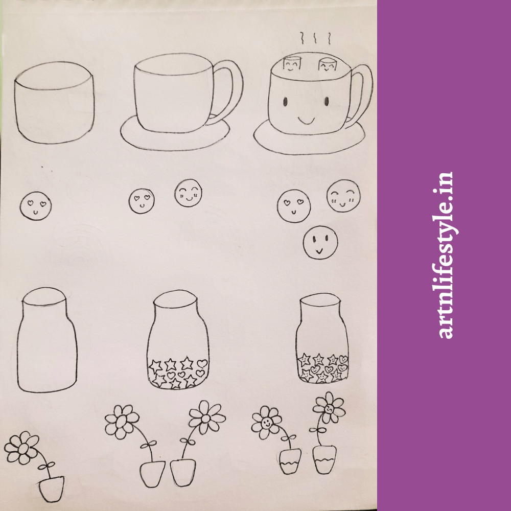 Here are some simple drawings like flowers, cute cups, emojis and a jar filled with stars.