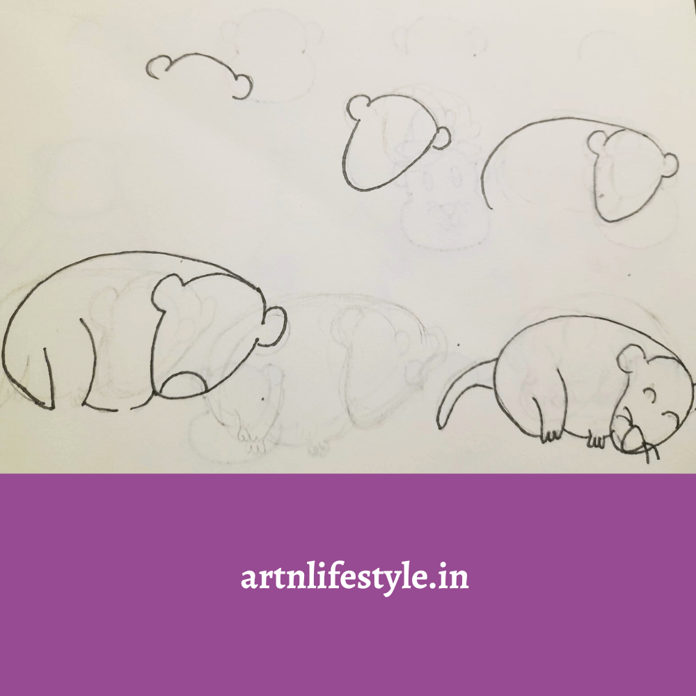 1.Draw a curves line and add the ears of the hamster. Then draw the outline of the hamsters face. Then draw the outline of the hamster’s body.