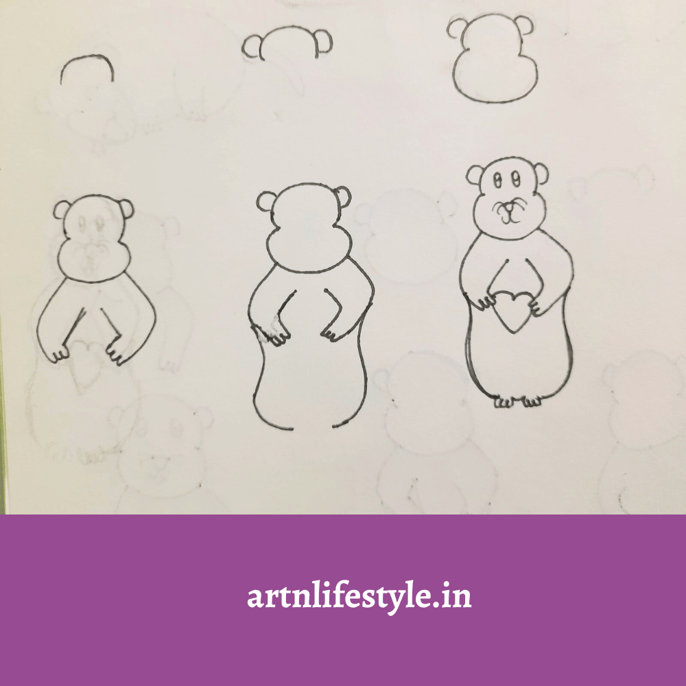 2.Then draw the body and add the legs. Finally add the facial features of the hamster and draw a heart.