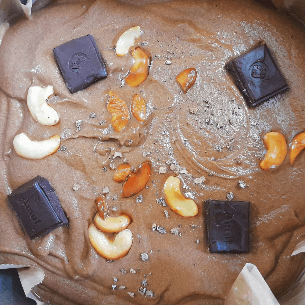 - Then take a mould and brush it with oil. Place a parchment paper and then pour the batter into the mould and finally top it with your favorite nuts. I personally love to top my batter with cashews cardamom powder and sugar free dark chocolate pieces. Slightly roasting your cashews before adding it to the batter can help to improve the taste.
