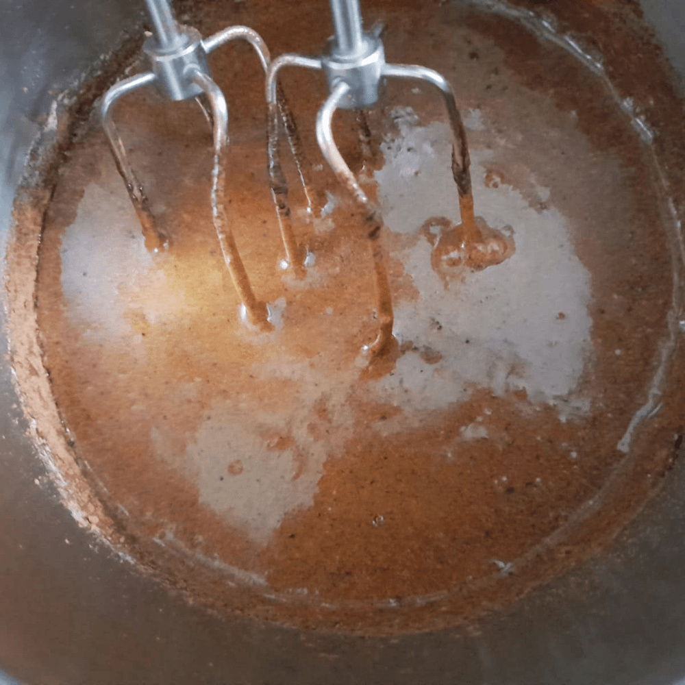 - Take a bowl add 100 gms of butter, 3/4 cup of jaggery or 1/2 cup powdered brown sugar. Then use a whisk or an egg beater to turn it into batter.