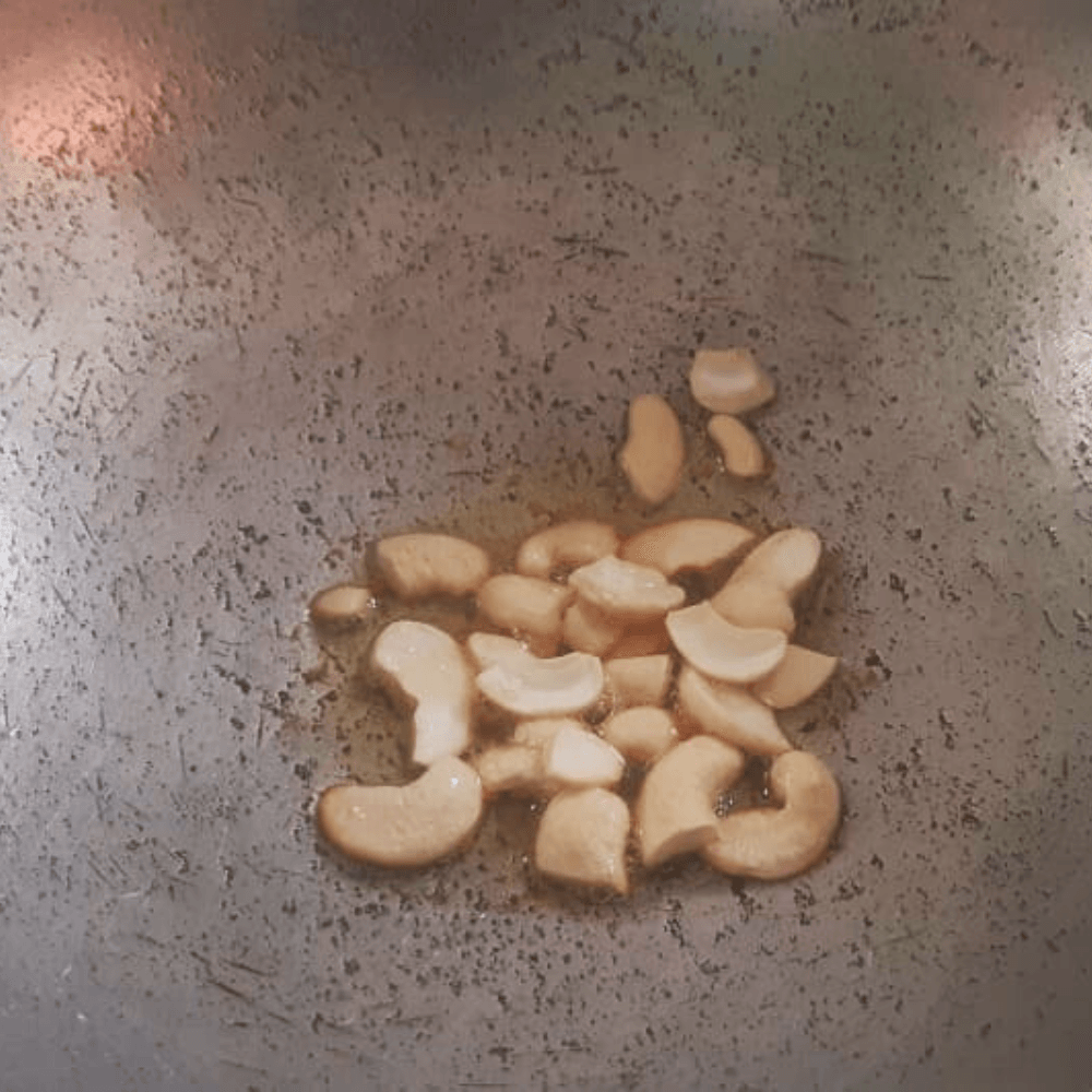 - Take a frying pan and add 1/2 table spoon of ghee. Then add your cashewnuts and deep fry them until they turn golden brown. You can also add raisins and cardamom if you want.