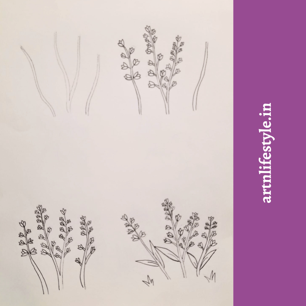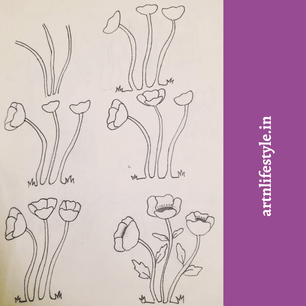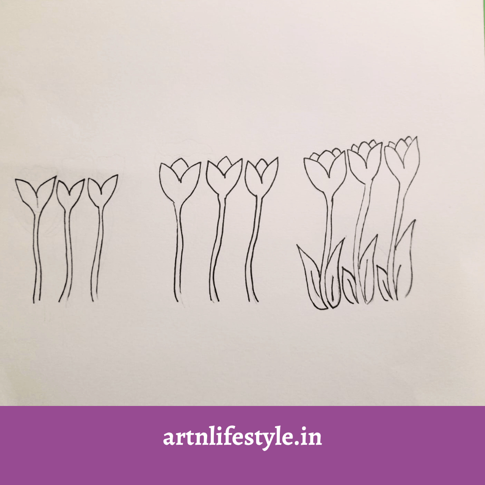 Start by drawing the flower’s stems. Next draw the flowers petal. Finally complete the sketch by drawing the leaves and the grass.