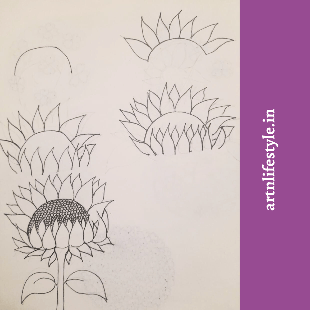 Draw a half circle. Then draw the upper petals. Then draw the lower petals facing upwards.Then add fullness by drawing inner layer of the petals. Next draw the stem and the leaves of the sunflower. Then draw the disc florets.