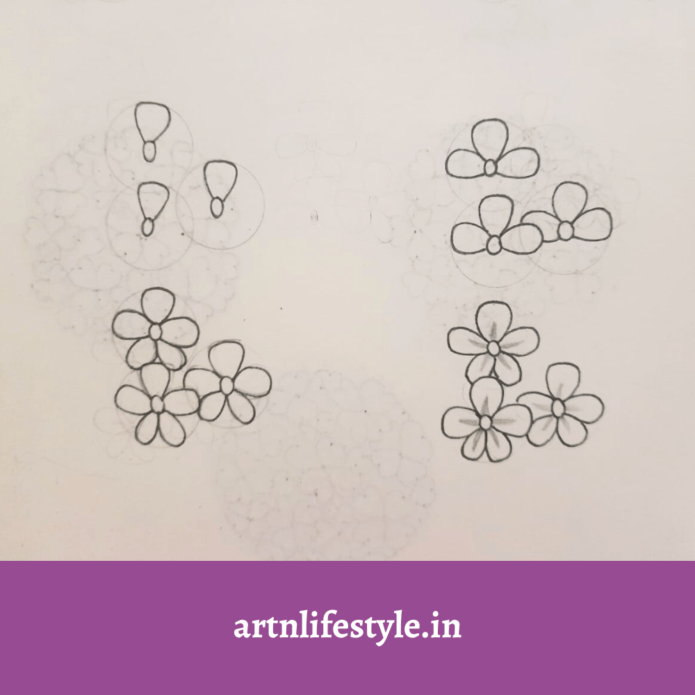 Draw three light circles using a stencil, then draw a three small circles for the flower’s center. Then draw the upper petal.Next draw the side petals. Then draw the two petals in the bottom. Once your flower drawing is completed, you can erase the light circles you have drawn.