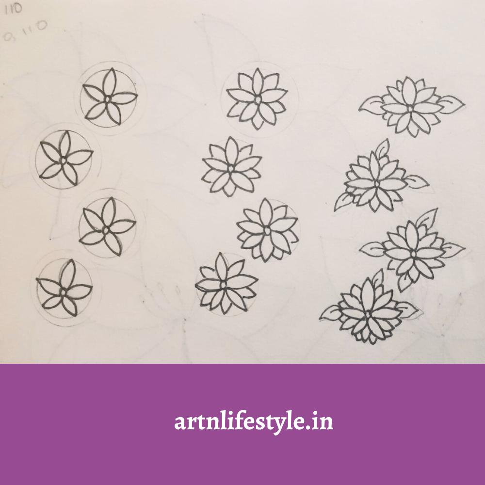 Draw 3 small circles for the flower’s center. Then draw the upper four petals. Next draw the lower 3 petals. For fullness draw second layer of petals between the first layer of petals.