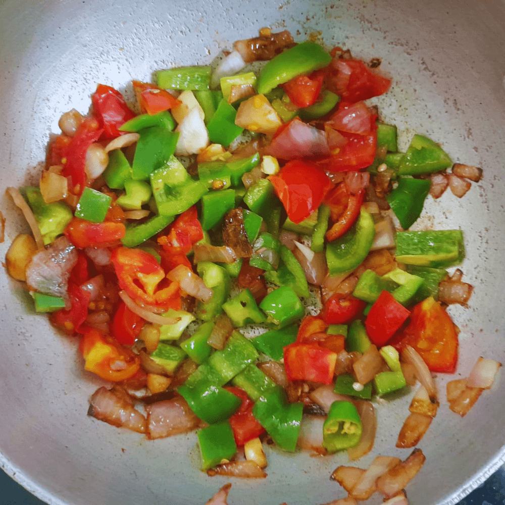 5.Once the tomatoes are cooked you can add the chopped capsicum to the frying pan.