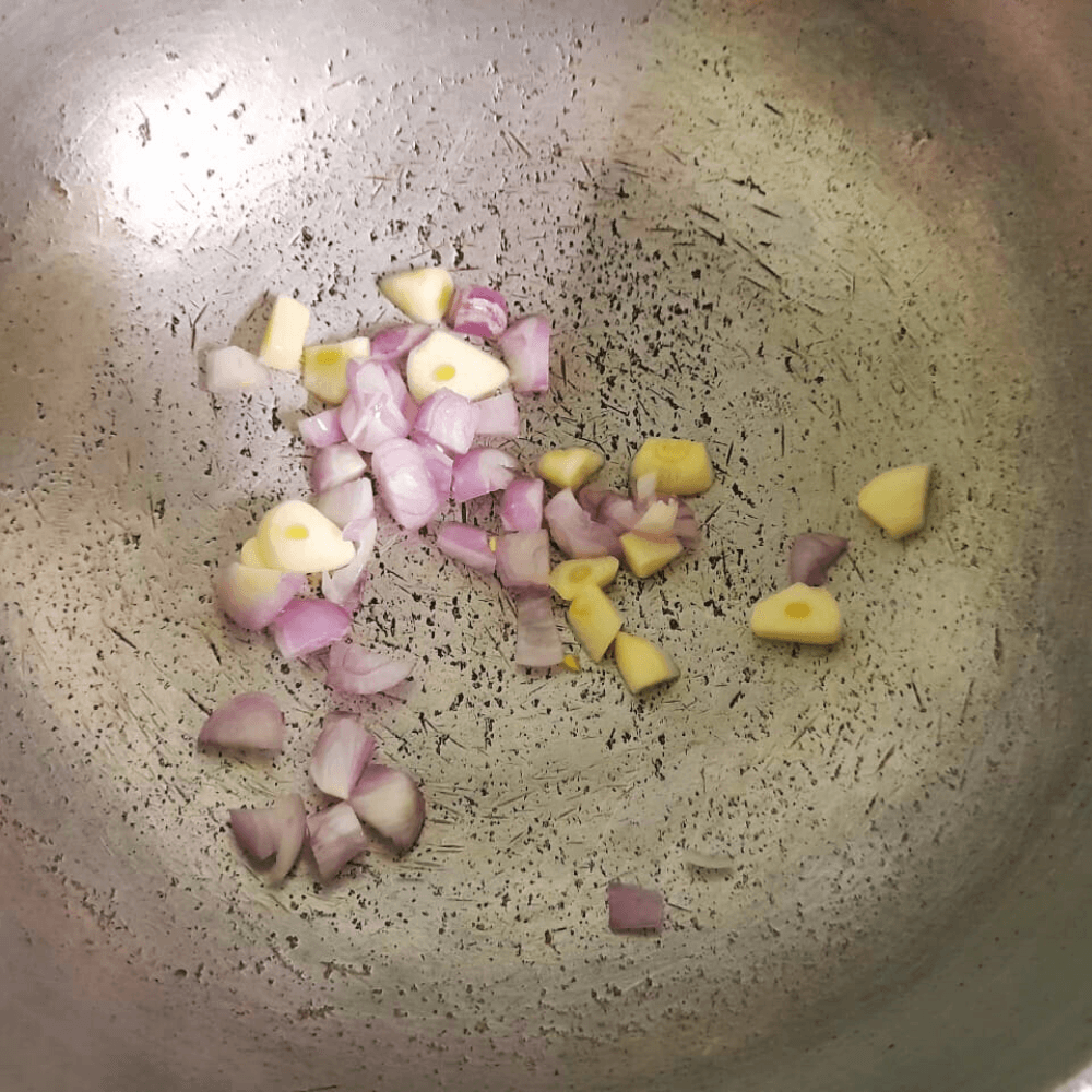 - Take a frying pan and add 1 tbsp of oil, 3 pieces of finely chopped onions 2 pieces of finely chopped garlic and sautee it lighty