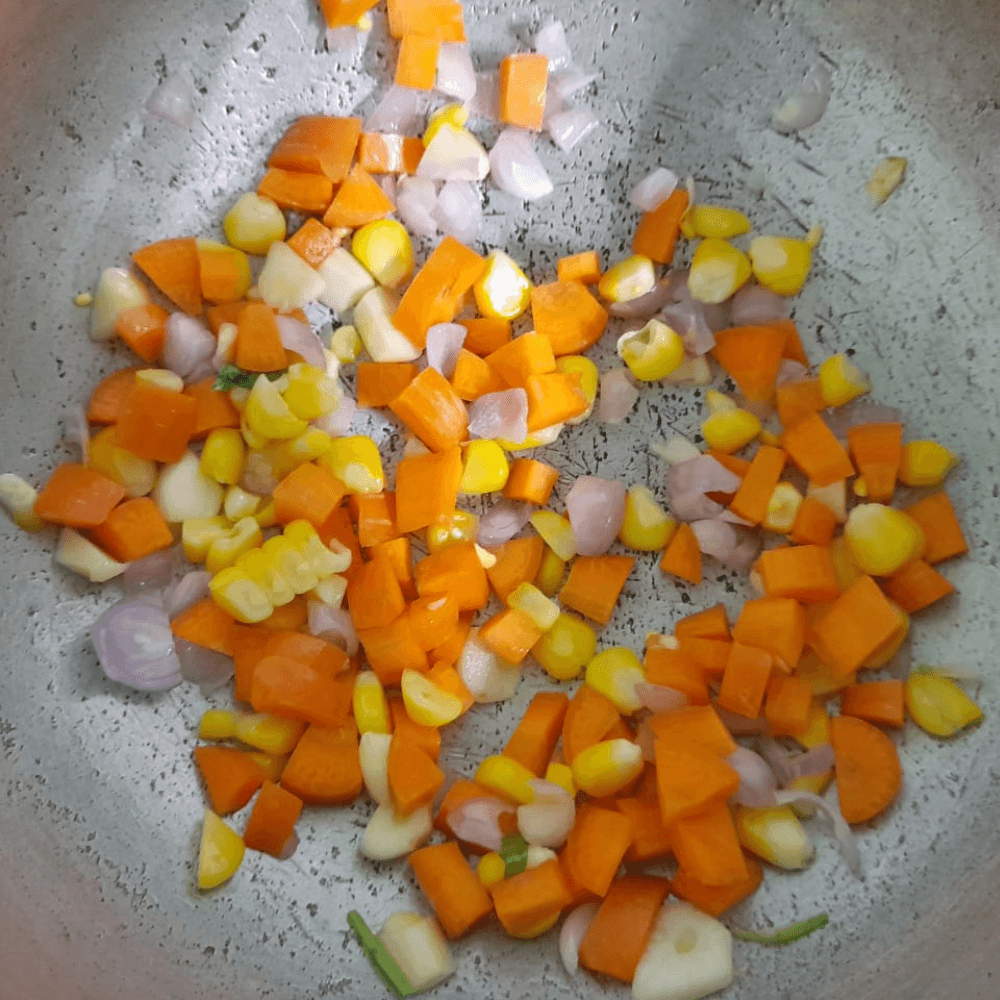- Then add the finely chopped carrot pieces and 2 tbsp of corn kernels and sautee it lightly. Add 1 teaspoon of salt and pepper
