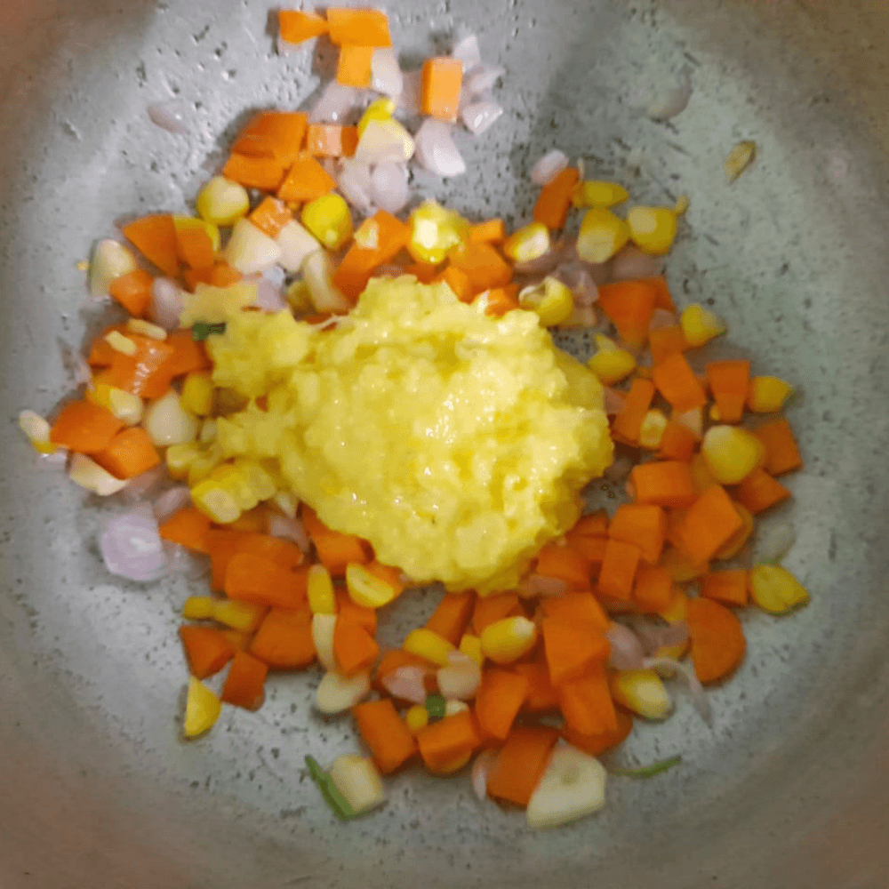 4.Add the corn slurry to the cooked vegetables. and mix it well.
