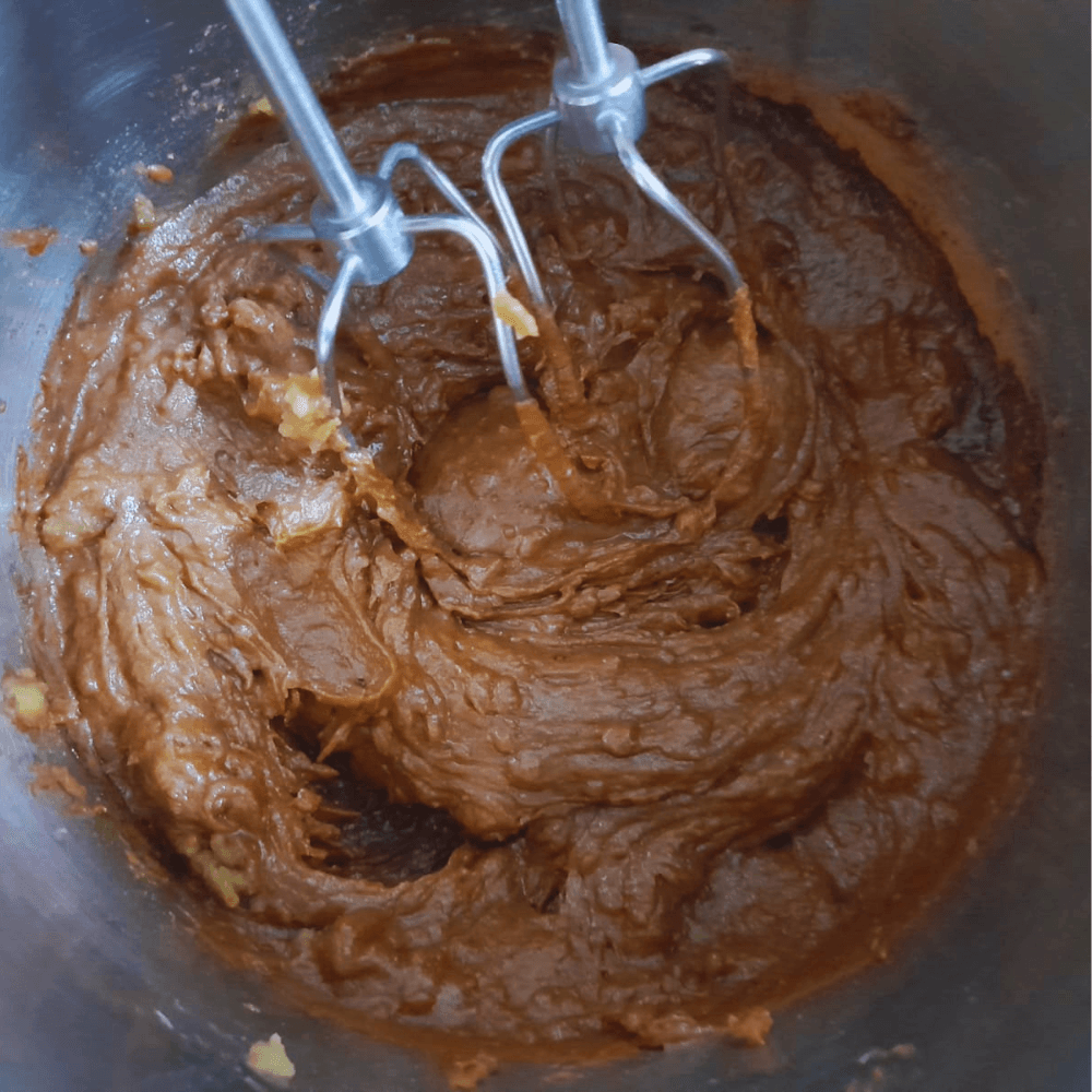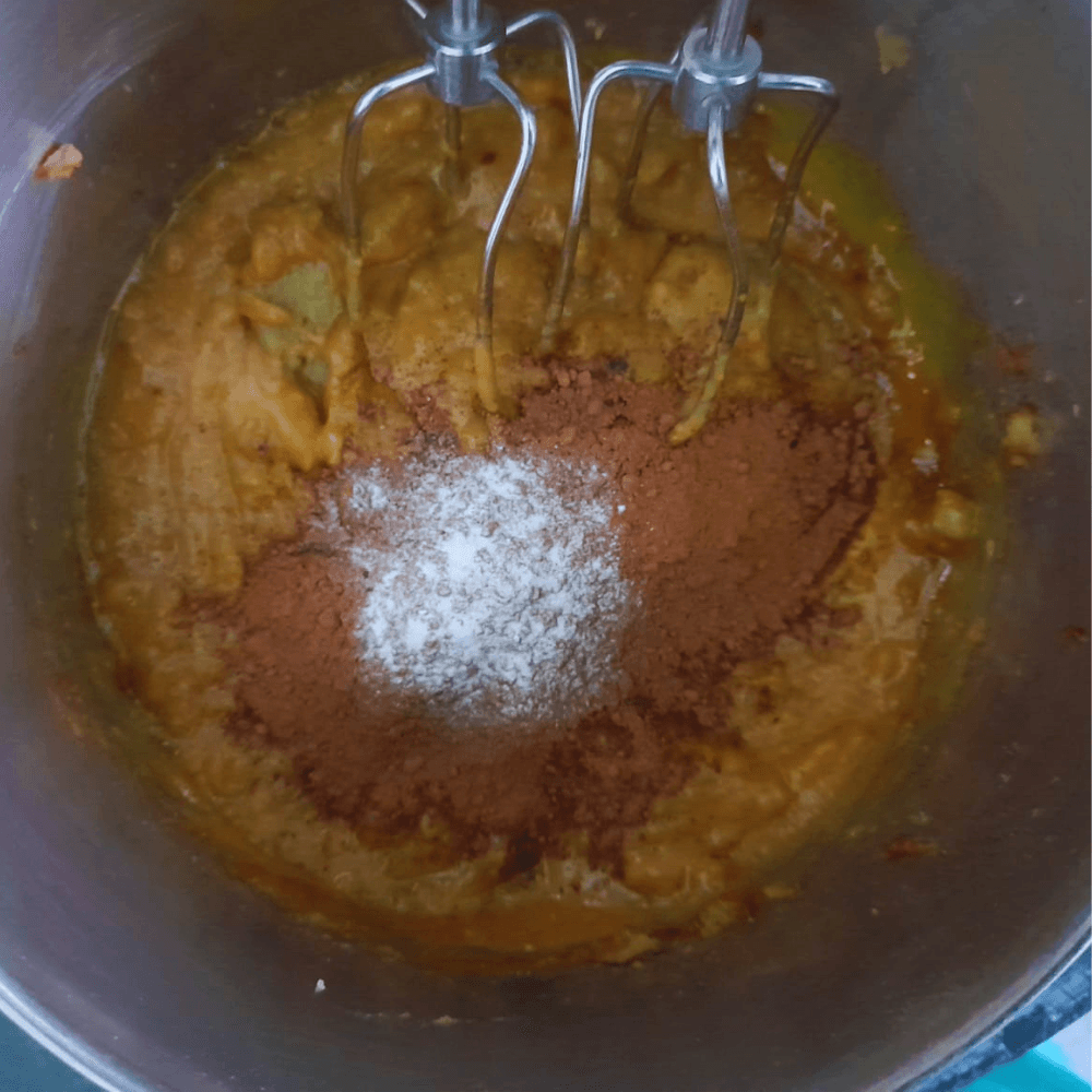 - Then add 2 eggs and mix it. Then add 1/4 cup of cocoa powder and 1/4 tsp of baking powder give a good mix